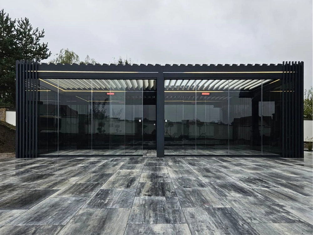 Die Sunline Pergola vereint Beschattung, Überdachung und intelligente Belüftung in einem kubistischen Design mit klaren Linien – eine elegante Bereicherung für Ihr Zuhause oder Büro in Wien und Niederösterreich. Lamellen, die sich per linearer Motorsteuerung von 0° bis 140° präzise an Sonne, Regen und Wind anpassen, leiten Wasser über eine integrierte Regenrinne ab und garantieren stets trockene Flächen darunter. Spezielle Dichtungen sorgen für perfekte Wasserdichtigkeit und verhindern jegliche Vibrationen bei starkem Wind für langlebigen, wetterunabhängigen Komfort.