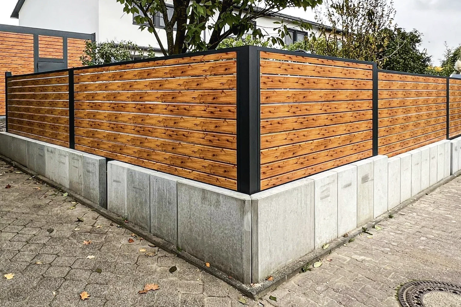 Sie haben die Wahl zwischen Aluminiumpaneelen in verschiedenen RAL-Farben, stilvoller Holzoptik oder natürlichen Holzpaneelen aus sibirischer Lärche. So gestalten Sie Ihren Zaun ganz nach Ihrem persönlichen Geschmack und passend zur Architektur Ihres Hauses.